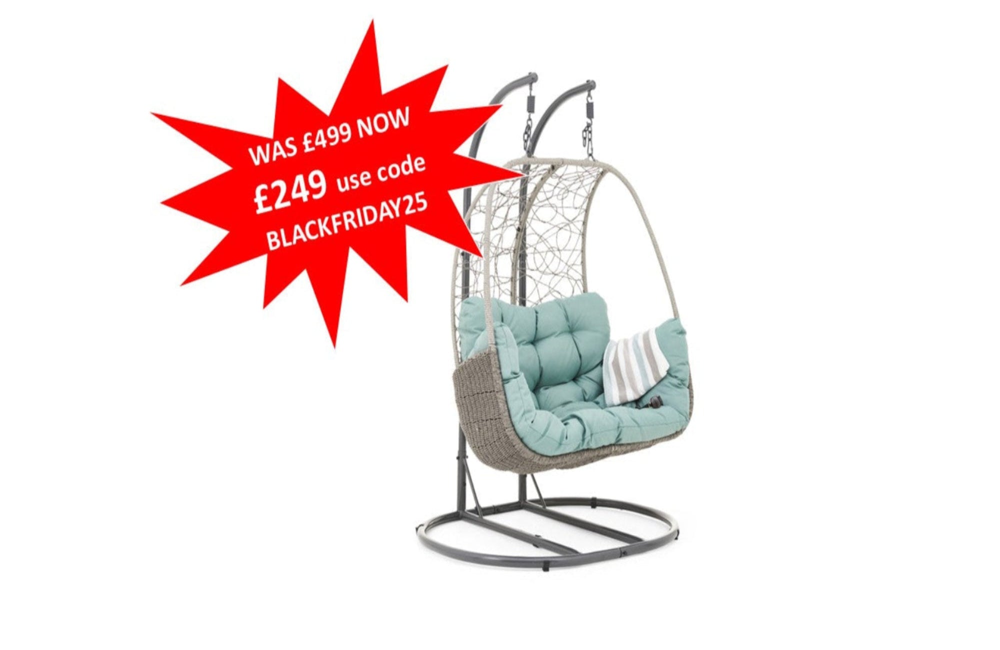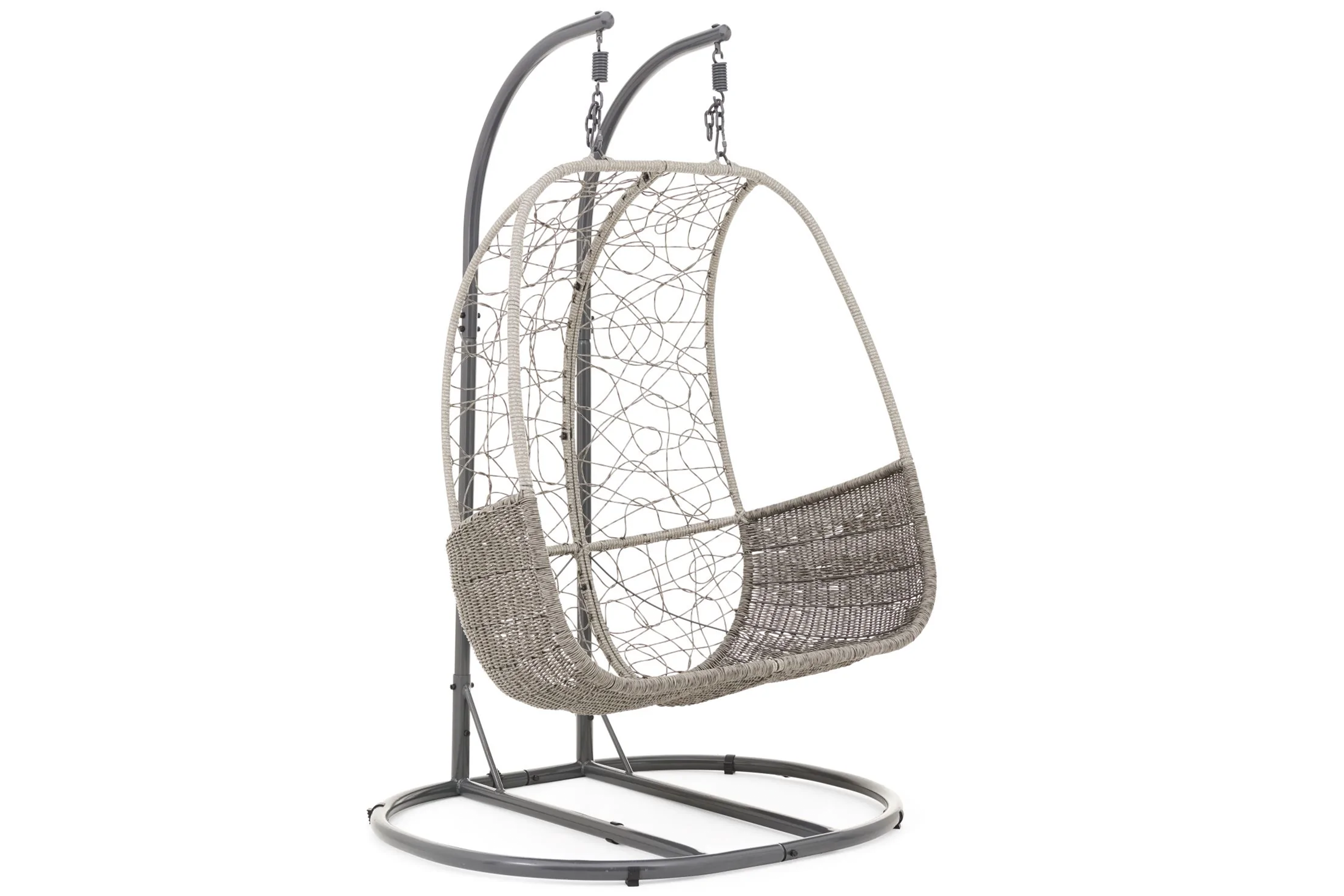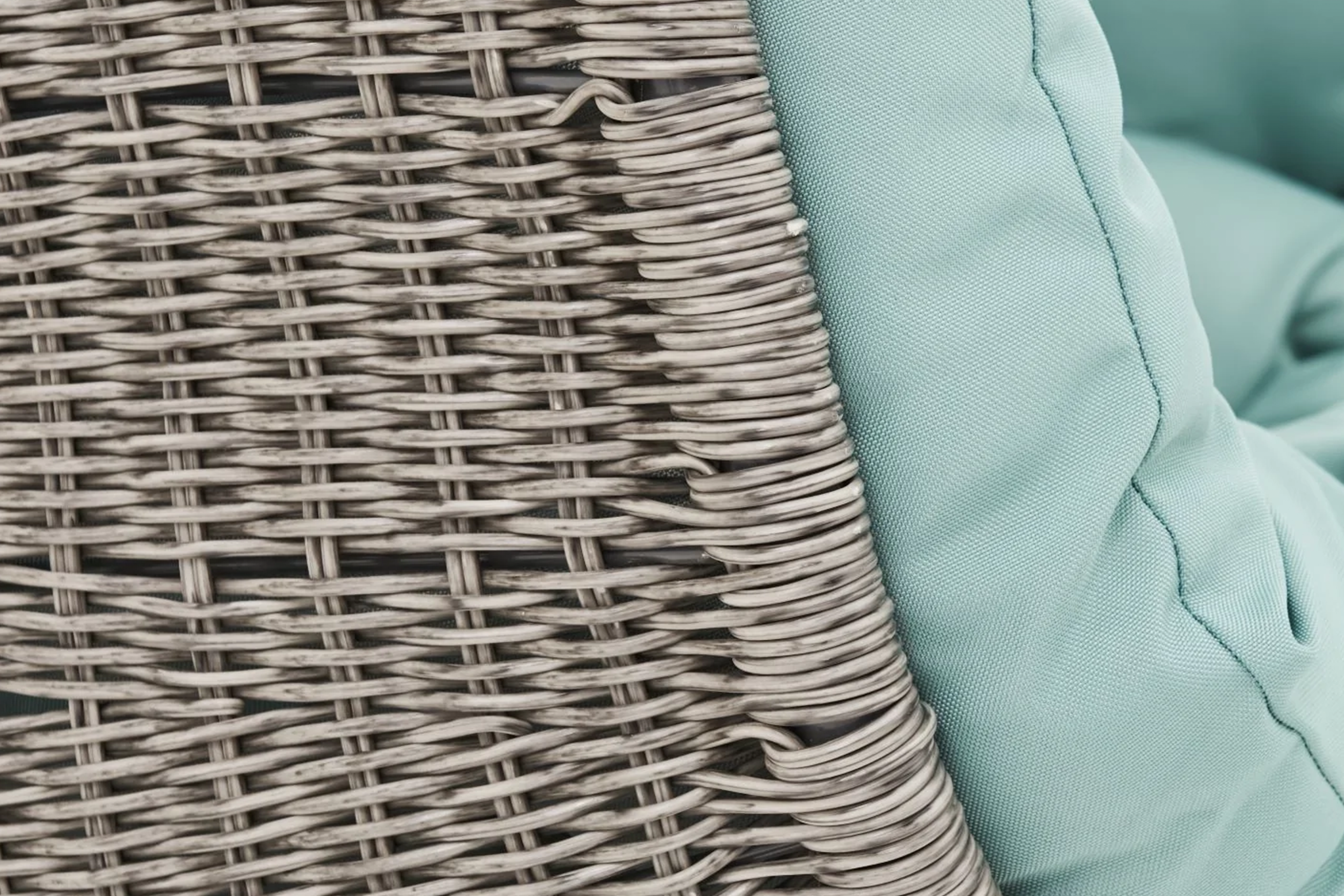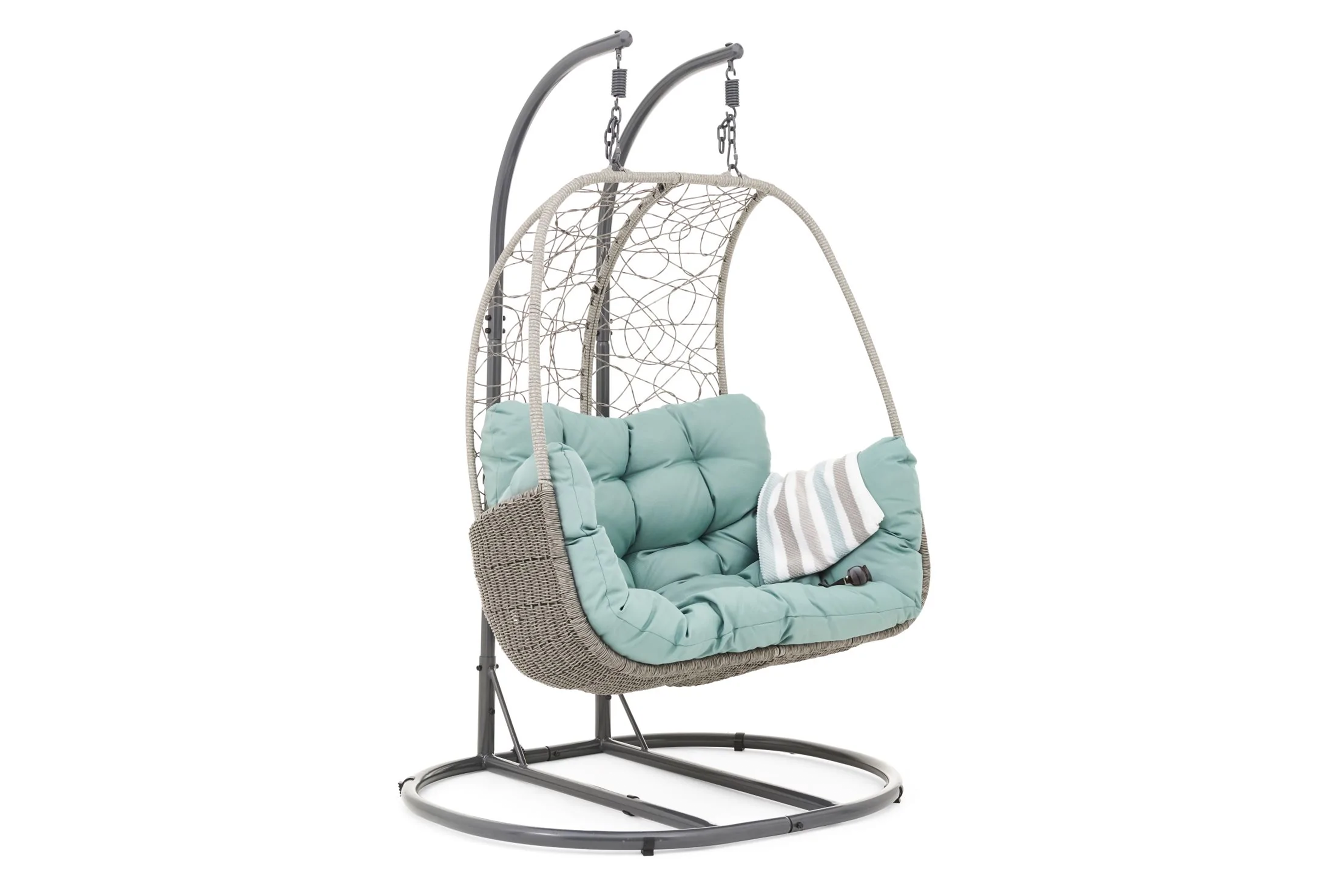 Relax in style with this beautiful double rattan hanging basket chair ๐ฟ. Designed to make you feel weightless as it gently hangs above the ground, it features thick pastel green cushions and a stylish grey rattan weave โ perfectly sized for two to enjoy together! ๐